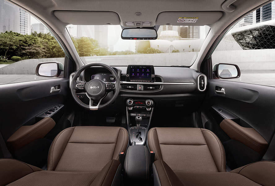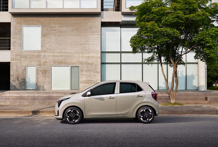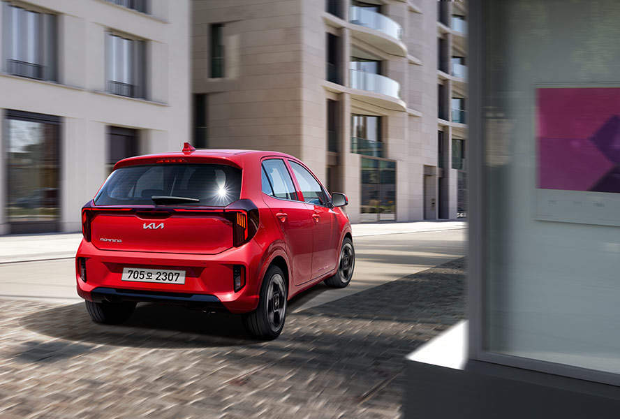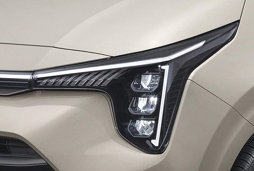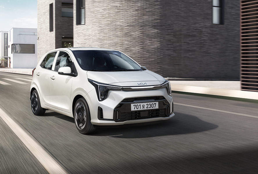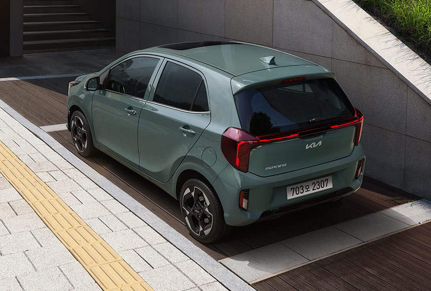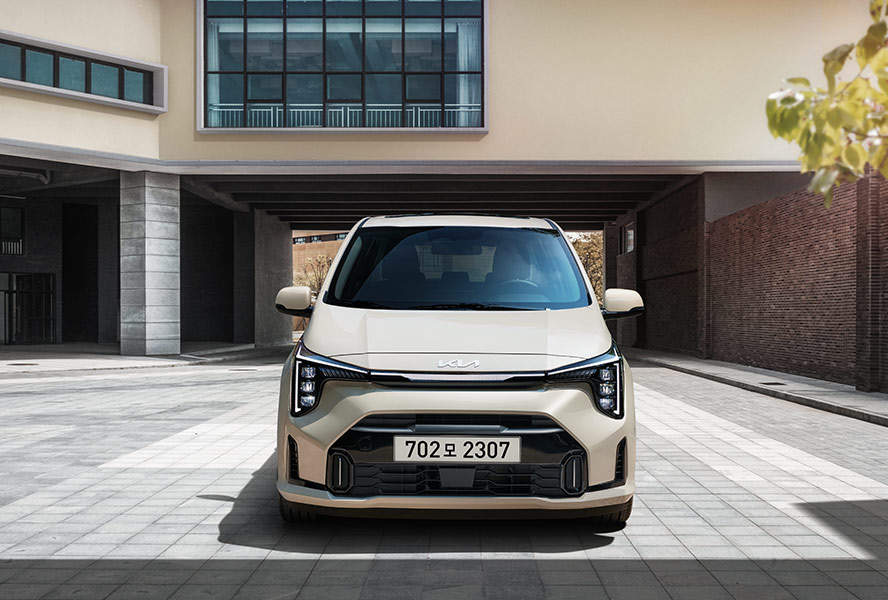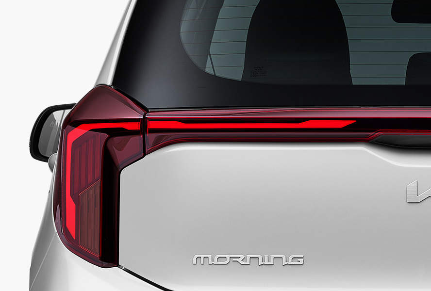 더뉴 모닝은 동급 최초로 LED 헤드램프와 센터 포지셔닝 램프를 적용했다. 기아 EV9처럼 별자리에서 영감을 받은 ‘스타맵 시그니처 라이팅’을 구현했다. 빗살무늬 주간주행등(DRL)은 차체 안쪽으로 이동했다. 좌우 램프를 하나의 선처럼 이어 실제보다 더 넓어 보인다. 여기에 ‘송곳니’처럼 위, 아래가 수직으로 배치된 헤드램프와 에어 인테이크 장식으로 ‘각진 매력’도 추구했다.